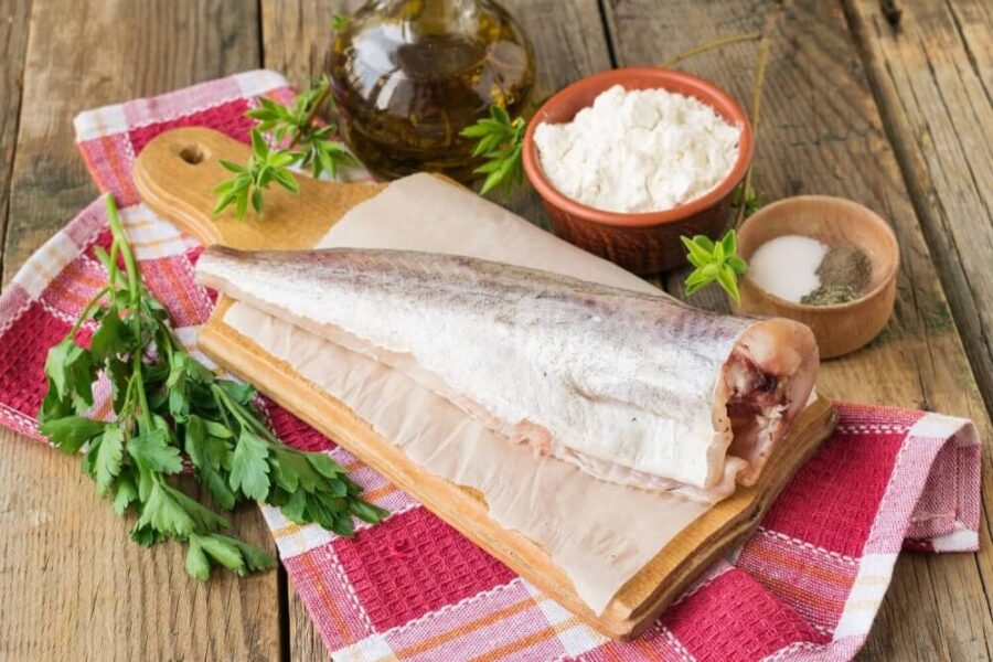 1. Очищаем минтай от чешуи с помощью ножа и промываем его водой. Сушим тушки рыбы бумажным полотенцем. Разрезаем на крупные куски. Укладываем рыбу в большую широкую миску, добавляем соль и специи по вкусу. Тщательно перемешиваем массу руками, чтобы все кусочки равномерно пропитались приправами.