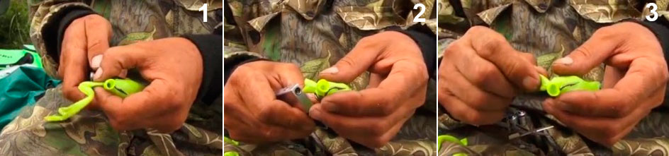 Некоторые рыболовы производят не сложную доработку силиконовой лягушки, что увеличивает количество поклевок в несколько раз. Процедура доработки заключается в следующем. Берут силиконовую лягушку и отрезают ей лапки, оставляя от них где-то 1 см. Поскольку лягушка пустотелая, то ее необходимо герметизировать. Для этого, остатки лапок расплавляют зажигалкой и прижимают пальцами. Лапки склеиваются, и лягушка становится герметичной. После этого, в спине лягушки делается тонкое отверстие. Когда змееголов ударяет по приманке, то из нее выбрасывается воздух под давлением, что провоцирует змееголова на дальнейшие действия.
