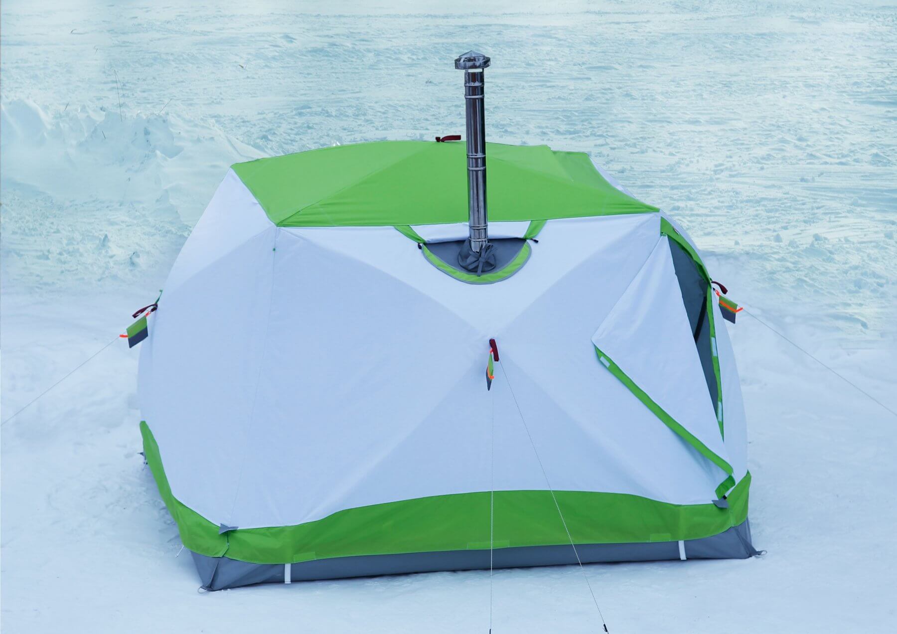 Немаловажен и цвет палатки. Производители используют светлые тона материалов, чтобы в палатке было максимально светло. При этом на тенте обязательно должны быть яркие элементы, которые будут выделять палатку на снегу.