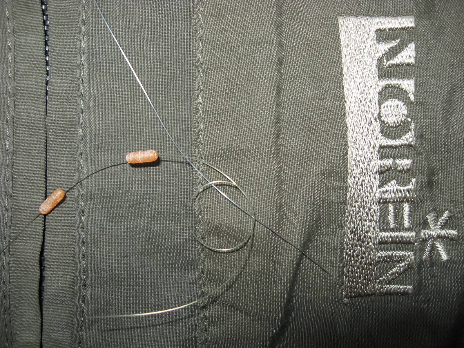 - Леска продевается в отверстие придерживаемого крючка на 25-30 см. Возвращается к основе.