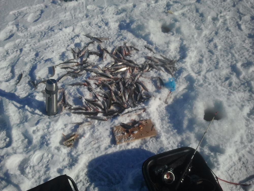 После поимка первой корюшки нарезаю её на кусочки и насаживаю на две – три мормышки, взамен карасёвой резки. Наблюдаю за клёвом, веду в голове статистику, далее исходя из предпочтений рыбы на текущий момент меняю снасти и насадку – и смотрю на результат.