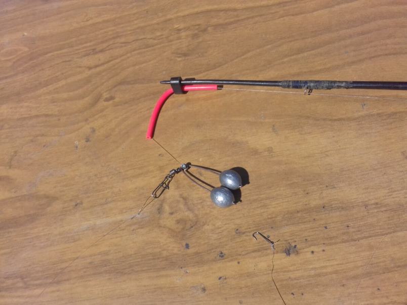 Затем на леску крепится стопорящий демпфер или бусинка, после чего делается узловая петля. Поводок длиной 40-60 см крепится к основной леске способом петля в петлю или через вертлюжок.