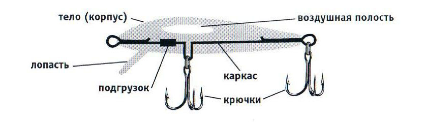 Тело – главная часть конструкции приманки, внешний вид которой сконструирован как подобие рыбки либо иной естественной наживки (например, рачок). Некоторые модели имеют тело, состоящее из двух частей, для большей подвижности в воде.
