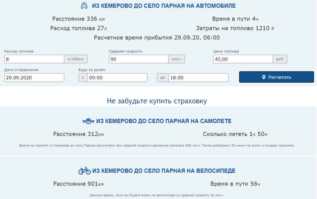 Калькулятор оказал мне услугу и посчитал время в пути следования на самолете ( вот только, самолеты туда не летают). И мое любимое, из Кемерово до село Парная на велосипеде. 56 часов пути.