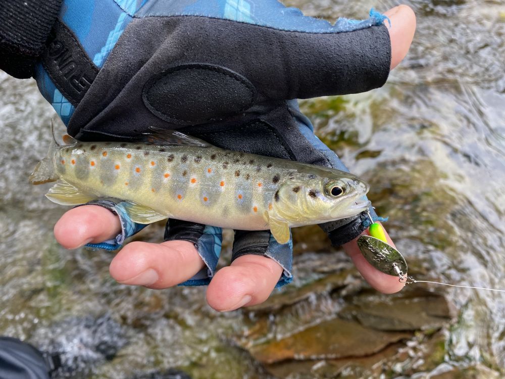 Но у нас с Фёдором были свои домашние заготовки по приманкам. Федя предпочёл вращающиеся блёсны Smith AR-S, я же ловил на тонущий воблер Smith D-Compact 45. Сильное течение Гвандры моментально сносило мою приманку, приходилось искать «окошки» с более-менее спокойной водой, где потенциально могла стоять форелька.