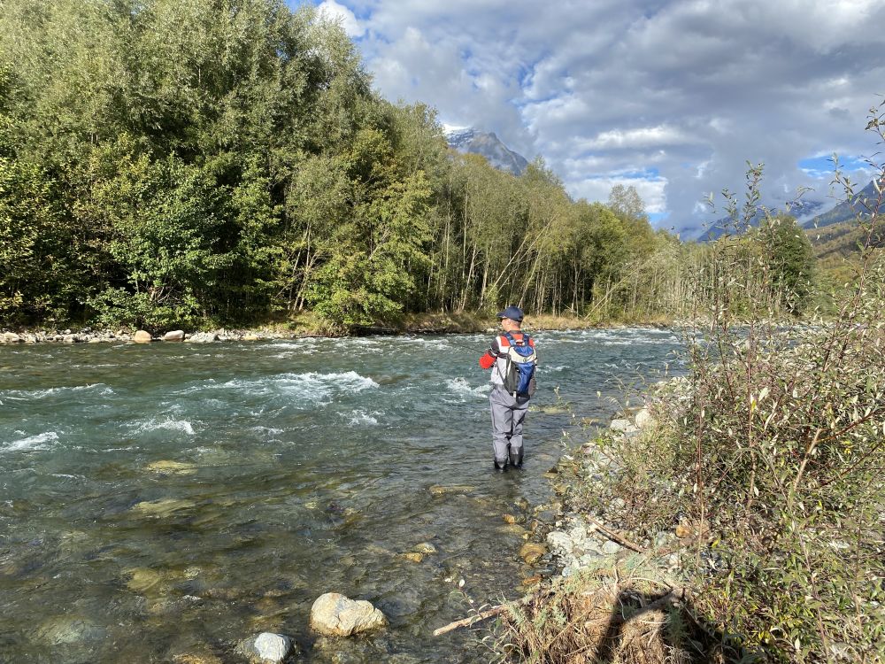 Нашей целью была река Гвандра. При подъезде к ней открылся еще более сногсшибательный вид на горы, с ледяных вершин которых она брала свое начало. Прозрачность воды была идеальной, «безотказная река» – так сказал про неё наш гид. В это день мы планировали плотно порыбачить, поэтому сразу влезли в вейдерсы, приготовили к бою снасти. И в сопровождении гида мы с Фёдором устремились к устью, где Гвандра сливается с Кодором, а Татьяна осталась вблизи временного лагеря – проверять обширные перекаты на предмет пятнистых душ.