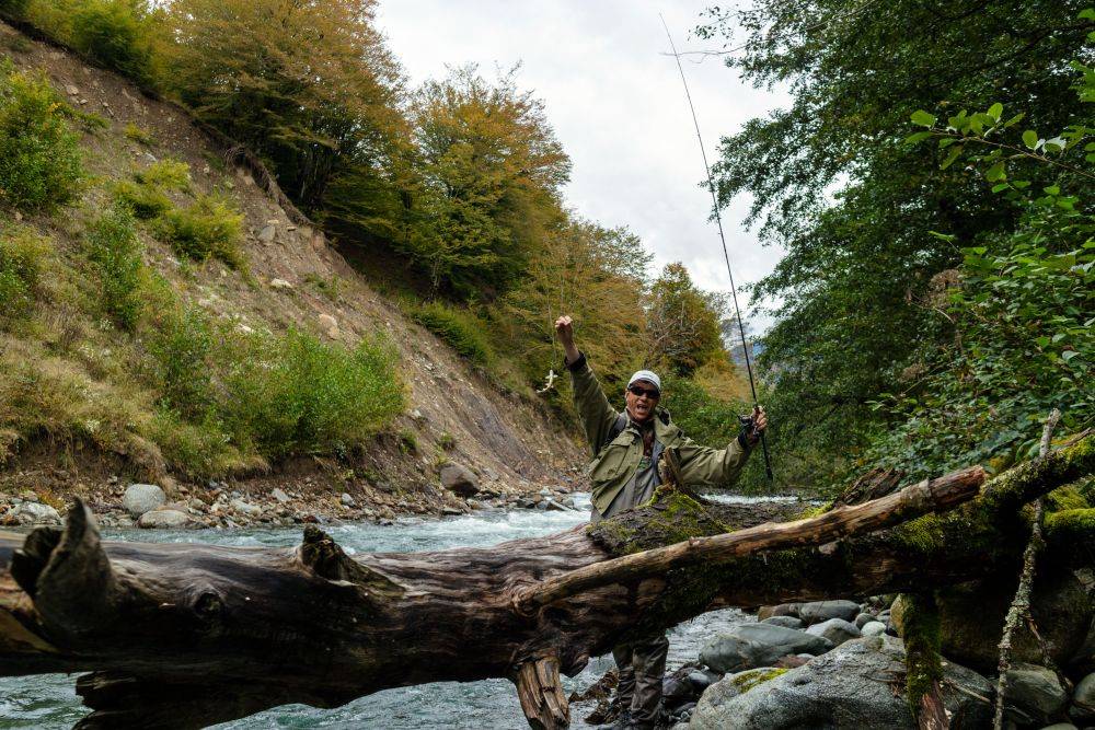 Фёдор в проводке больше надеялся на снос приманки и даунстрим. Мой же стиль ловли принципиально отличался от Фединого – я старался облавливать «свой» берег, делая забросы апстрим и выманивая на паузах любопытную форельку из её укрытий. В общем, было сложно, но своего результата мы добились. О чём не раз свидетельствовали поднятые Федей вверх руки после очередной реализованной поклевки. Рыбалка оказалась трудовая, поэтому каждая поклевка была у нас на счету.