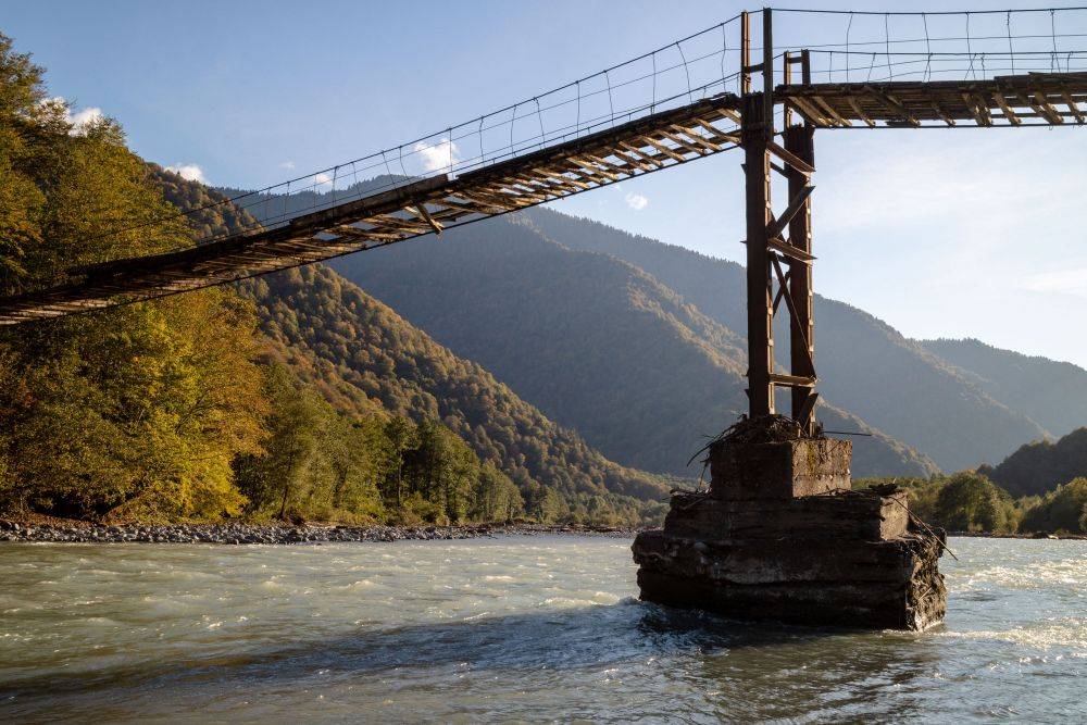 После завтрака заправили горючку в наш внедорожный «броневичок» и отправились на разведку новой реки. По пути сделали остановку на мосту через Кодор. Река выглядела всё так же безумно, как Дейнерис Таргариен, и пока была не доступна для рыбалки. Но окружающие пейзажи казались невероятными, в этот день четко виднелись даже ледники на горных вершинах.