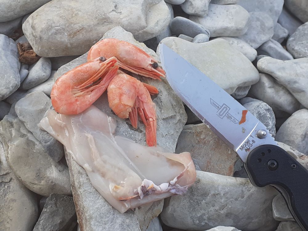 Хотя, если задаться целью, то разыскать, наверное, можно. Мы же наживку привозили из дома замороженную – в небольшом термосе ночную дорогу она перенесла отлично. На рыбалку наживку тоже лучше брать порционно, оставляя излишки в морозилке, чтобы не портились. Расход у неё довольно маленький – 200-граммового кусочка кальмара и полтора десятка креветок нам на три рыбалки хватило с большим избытком, так что мы ещё смогли оставить угощение для крабов (фото 13).