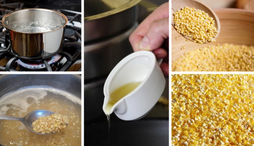 - в отдельной посуде смешать по 2 стакана кукурузной и ячменной крупы (можно заменить на дроблёную пшеничную или перемолотый горох);