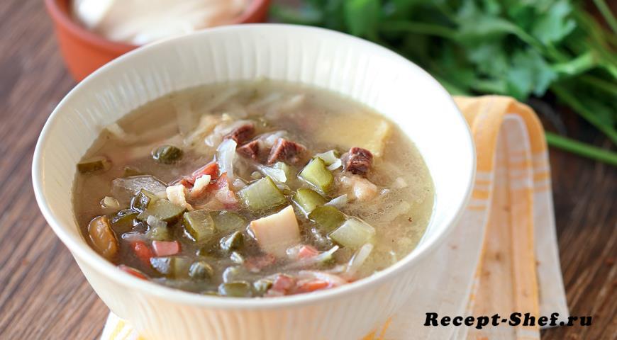 Нарежьте ветчину, колбасу и язык мелкими кубиками, сосиски – кружками, соленые огурцы порежьте кубиками, маринованные грибы — маленькими кусочками. Добавьте в кипящий суп курицу и говядину, ассорти мясных продуктов, огурчики и грибы. Варите около 5 минут и отставьте суп на полчаса. Попробуйте на соль, если требуется посолите, поперчите.