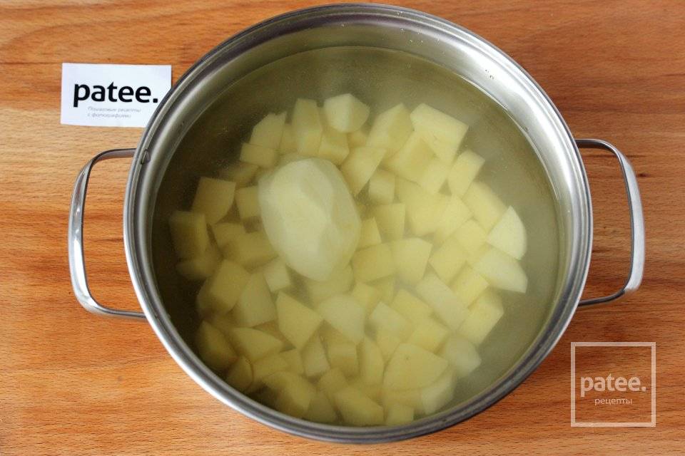 1. Почистить картошку, нарезать небольшими кусочками и положить варится в отмеренные 1,5 литра воды.