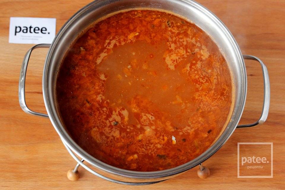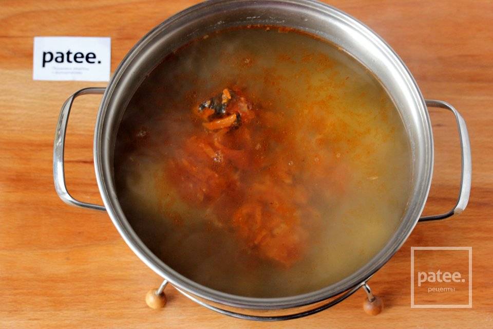 - После того, как картофель закипит, дайте ему провариться примерно 10 минут, а после добавьте в кастрюлю с бульоном зажарку.