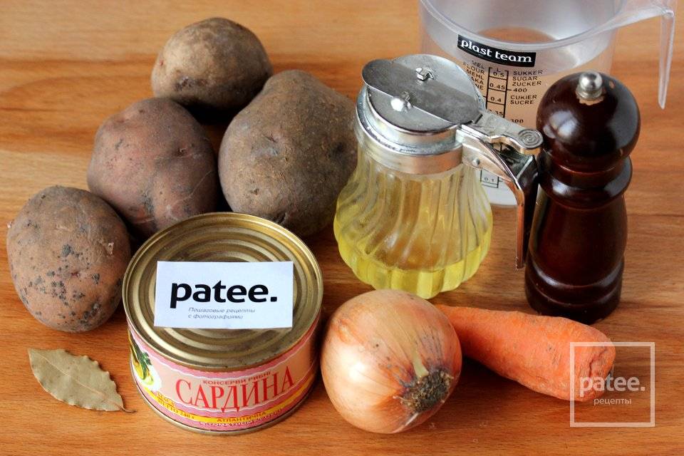 Для приготовления картофельного супа с сардиной в томатном соусе нам понадобятся следующие ингредиенты: картофель, морковь, репчатый лук, консервы “сардина в томатном соусе”, масло подсолнечное рафинированное, вода, лавровый лист, соль, чёрный молотый перец.