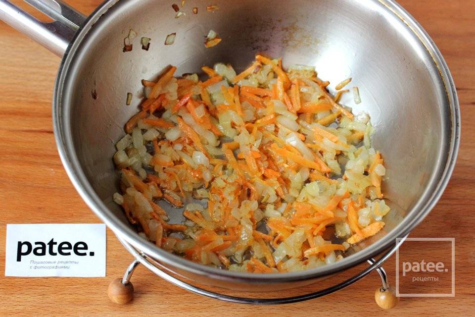2. Морковь натереть на крупной терке, лук порезать кубиками. Потушить их на антипригарной сковороде на растительном масле 5 минут.