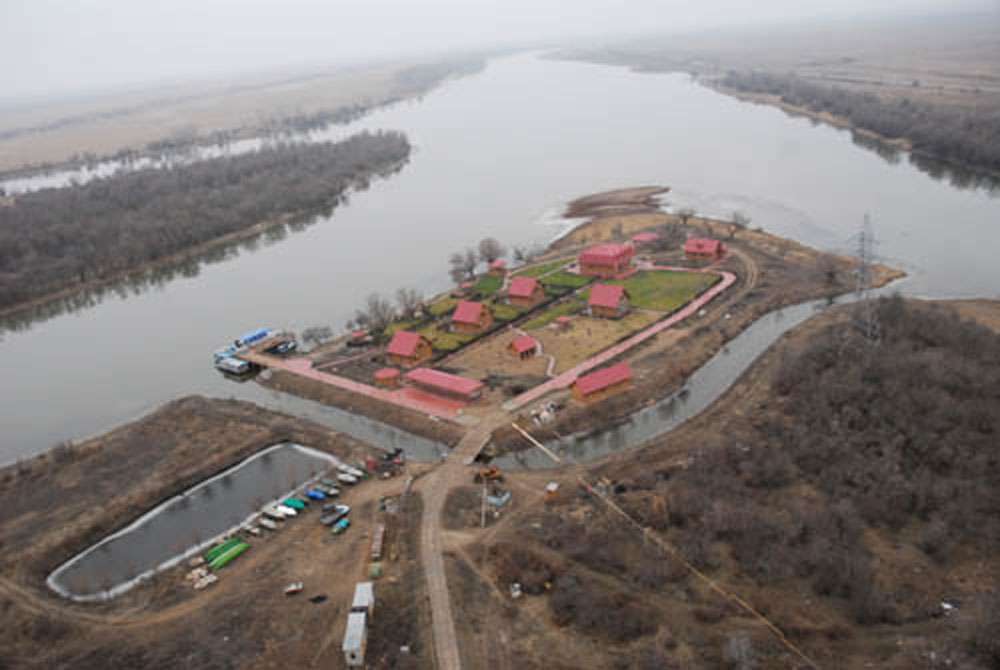 Срубовые коттеджи – всего их четыре, в срубах есть все удобства – вписаны в ландшафтную поляну, находящуюся в окружении пойменного леса. База расположена на левом берегу Волги в Волго-Ахтубинской пойме. Это территория Природного парка республики Калмыкия, границы которого примыкают к границам Астраханской области.