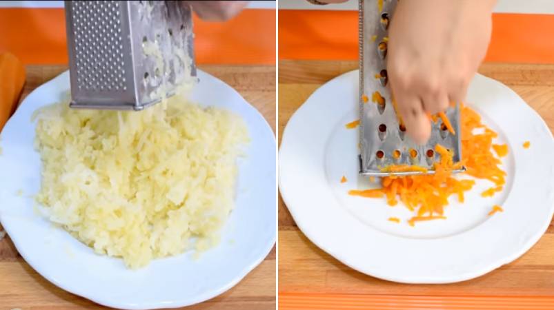 - Овощи вымыть, отварить в воде, которую подсаливают после закипания. После варки остудить холодной водой, очистить. Картошку и морковку измельчить на терке с отверстиями среднего размера.