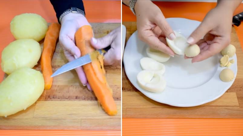 - Картофель и морковь, сварить в кожуре, затем остудить и очистить. Отварить вкрутую яйца, остудить и очистить.