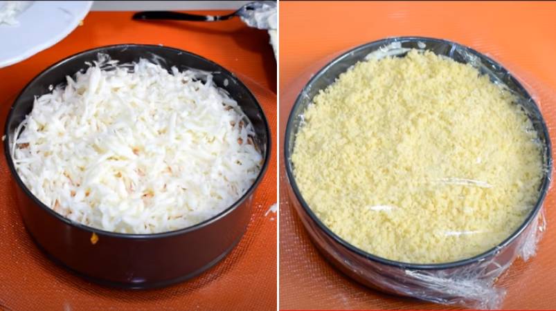 Ну, и в завершении нашего кулинарного спектакля прима, роль которой сыграл яичный желток. Выкладываем поверх всех ингредиентов тёртый желток, равномерно распределяем по всей площади салата. Накрываем форму пищевой плёнкой и убираем в холодильник как минимум на 1 час. Ингредиенты охладятся, познакомятся друг с другом, подружатся и создадут совместный неповторимый вкус.