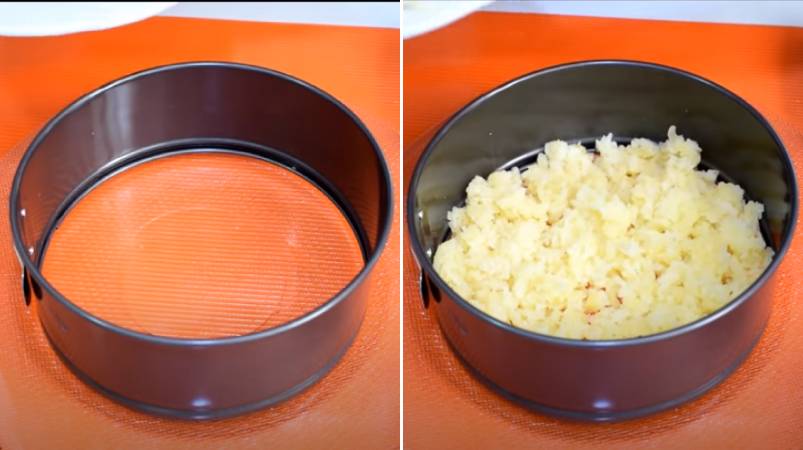 4. Собирать салат будем в сервировочном кольце, первый слой картофель, хорошо его уплотняем, особенно по краю кольца.