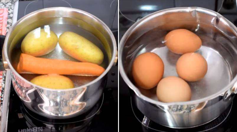 Шаг 1. В кастрюлю с водой кладем хорошо промытый картофель и морковь, при этом вода должна покрывать овощи. Ставим на огонь. Солим по вкусу и варим на среднем огне. Время приготовления будет зависеть от размера используемых овощей, но для приготовления потребуется не менее 20 минут. Чтобы узнать, приготовлены ли они, проколите их зубочисткой и убедитесь, что она входит без проблем и, когда вы поднимаете ее, картофель сразу падает.