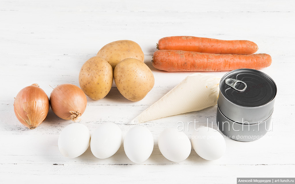 консервы рыбные – 1 банкаяйца куриные – 5 шт.картофелины среднего размера – 3 шт.морковь среднего размера – 3 шт.лук репчатый среднего размера – 1 шт.майонеззелень