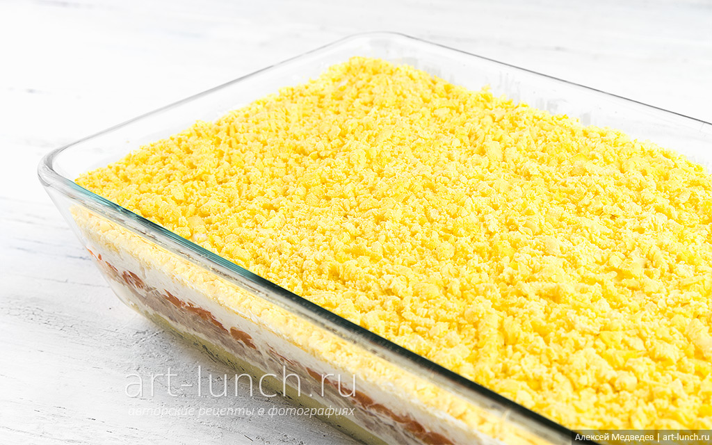 • Чтобы отстоявшийся салат смотрелся свежим, натирайте желтки непосредственно перед подачей на стол или просто прикройте салат на время пропитки пищевой пленкой.
