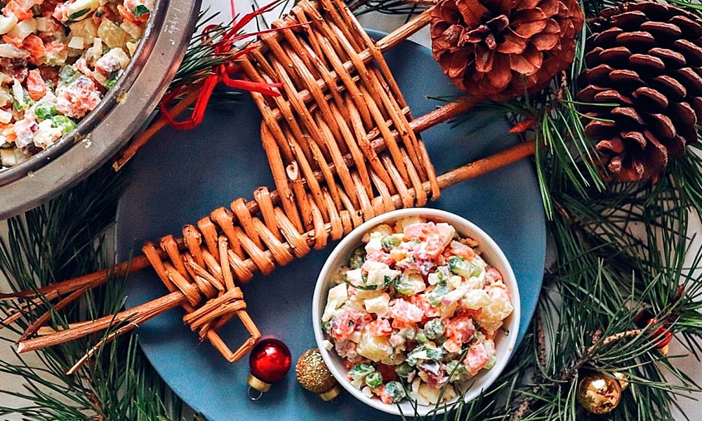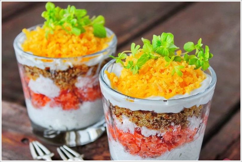 Готовят соус для заправки салата из майонеза, хрена, сливок и шинкованного укропа. Вместо одной из прослоек майонеза можно использовать измельчённый в кашицу авокадо. Он придаст неповторимый вкус блюду.