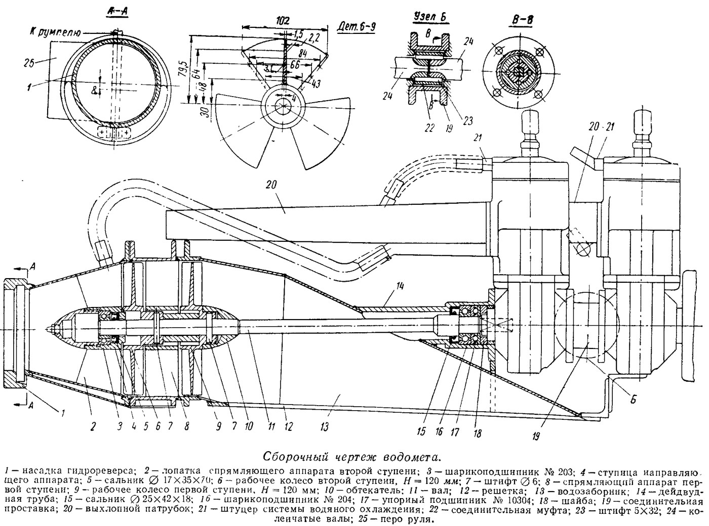 При окончательной сборке водомета перед навинчиванием фланца 7, в него вставляются крепежные болты 6, а место соединения стакана водозаборника и фланца герметизируется клеем «88»; ставятся рабочее колесо, шпонка 22 и кольцо 23, в редуктор заливается смазка, устанавливается спрямляющий аппарат. Собранный движитель крепится к дейдвуду так, чтобы шлицевая муфта наделась на хвостовик ведущей шестерни; система охлаждения соединяется с патрубком водозаборника.
