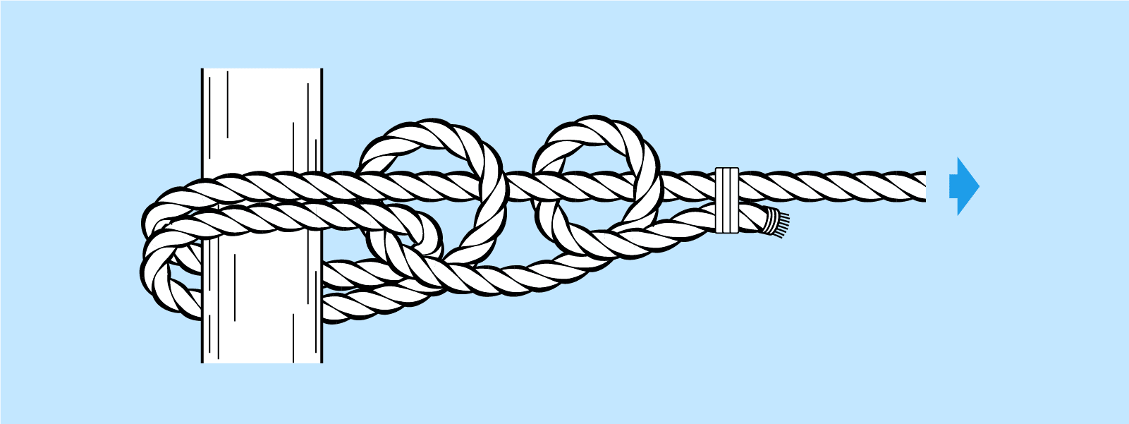 Вязать туристические «удавки» нужно на рабочей части, несколько раз обернутой ходовым концом, привязанным к опоре.