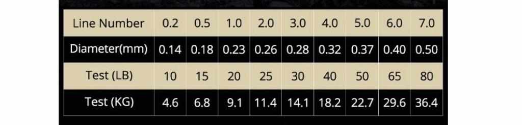 Если говорить о мононитях китайских компаний, то реальный диаметр шнура приходится определять только при его визуальном осмотре, так как информация на упаковке носит условный характер. Для примера можно привести таблицу характеристик одного популярного китайского бренда: