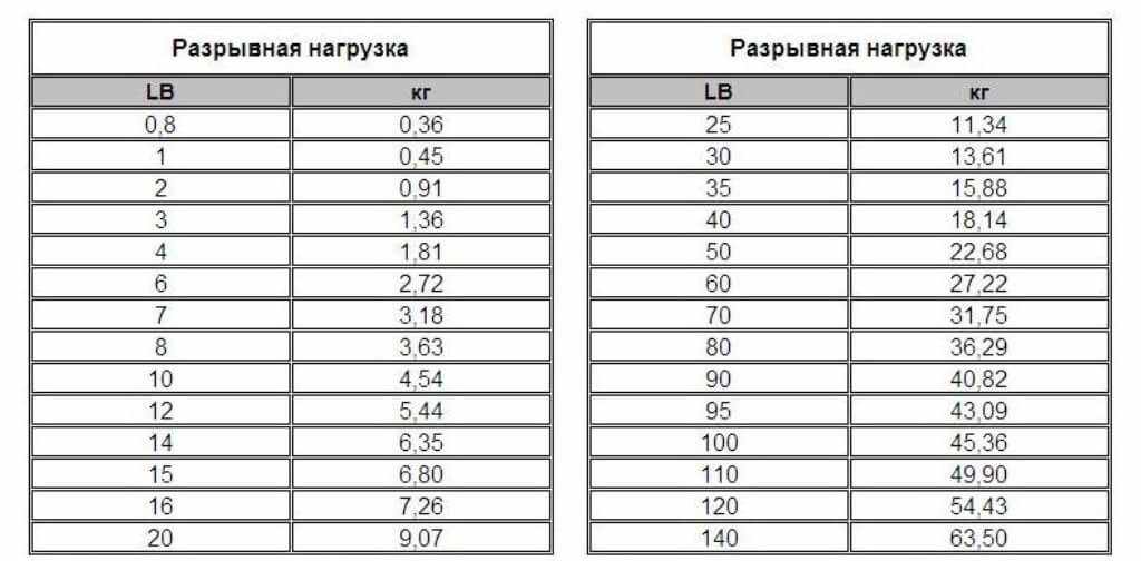 Разрывная нагрузка является более точным показателем, чем диаметр. Этот параметр позволяет узнать, какой максимальный вес выдерживает плетёнка. Его обычно указывают в фунтах (LB — либрах). Один либр равен 0,4536 кг. Для многих рыболовов измерение в таких единицах непривычно из-за чего возникает путаница. Чтобы быстро определить прочностные характеристики лески, можно воспользоваться следующей таблицей: