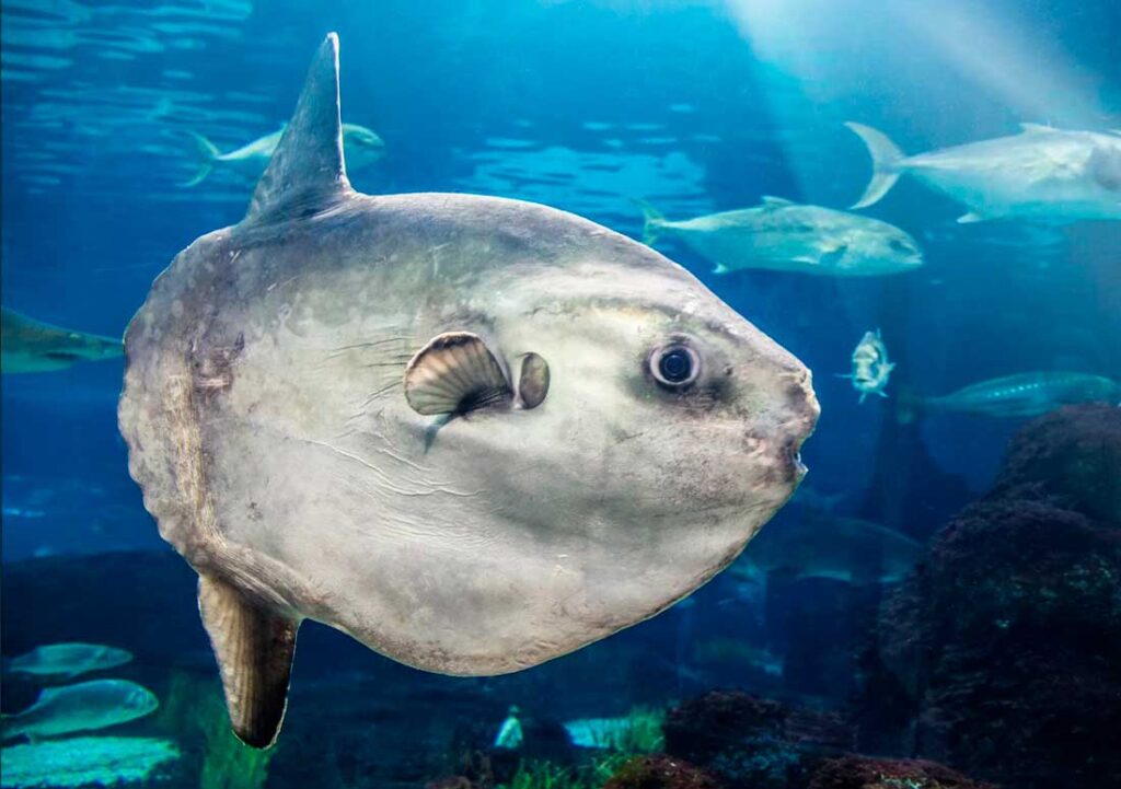 Самая большая из костных рыб в мире считается рыба-луна. У нее есть еще ряд названий: рыба-голова и рыба-солнце. Средняя длина 3 метра, но имеются сведения об экземпляре в 4,2 метра и 2,2 тонны. За счет того, что скелет содержит много хрящевой ткани эти рыбы достигают больших размеров. Тело луны напоминает диск, длина которого равна ширине. Зубы срослись в форме клюва, который не дает полностью прикрывать рот. Есть версия, что луна за счет глоточных зубов, может издавать скрежущие звуки. Её кожа имеет голубоватый цвет и лишена чешуи. Это не только самая большая, но и самая плодовитая рыба. За один раз самка приносит около 300 миллионов икринок. Рыба-солнце обитает во всех океанах, предпочитая большую часть времени проводить на глубине до 200 метров. Оптимальная температура воды должна быть около 10ºС. Пребывание в более теплой воде может вызвать гибель луны.