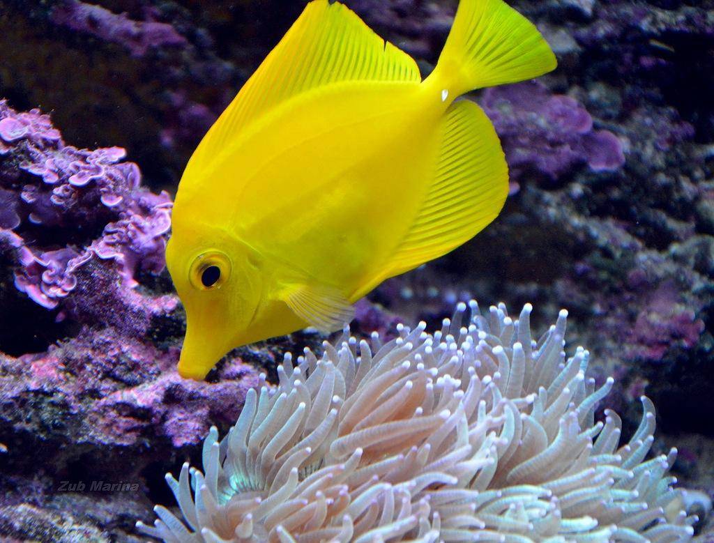 Зебрасома желтая – фенотип с ярким, насыщенным желтым цветом туловища. В длину вырастают до 20 см, и по сравнению с сородичами, являются одним из самых неконфликтных видов.