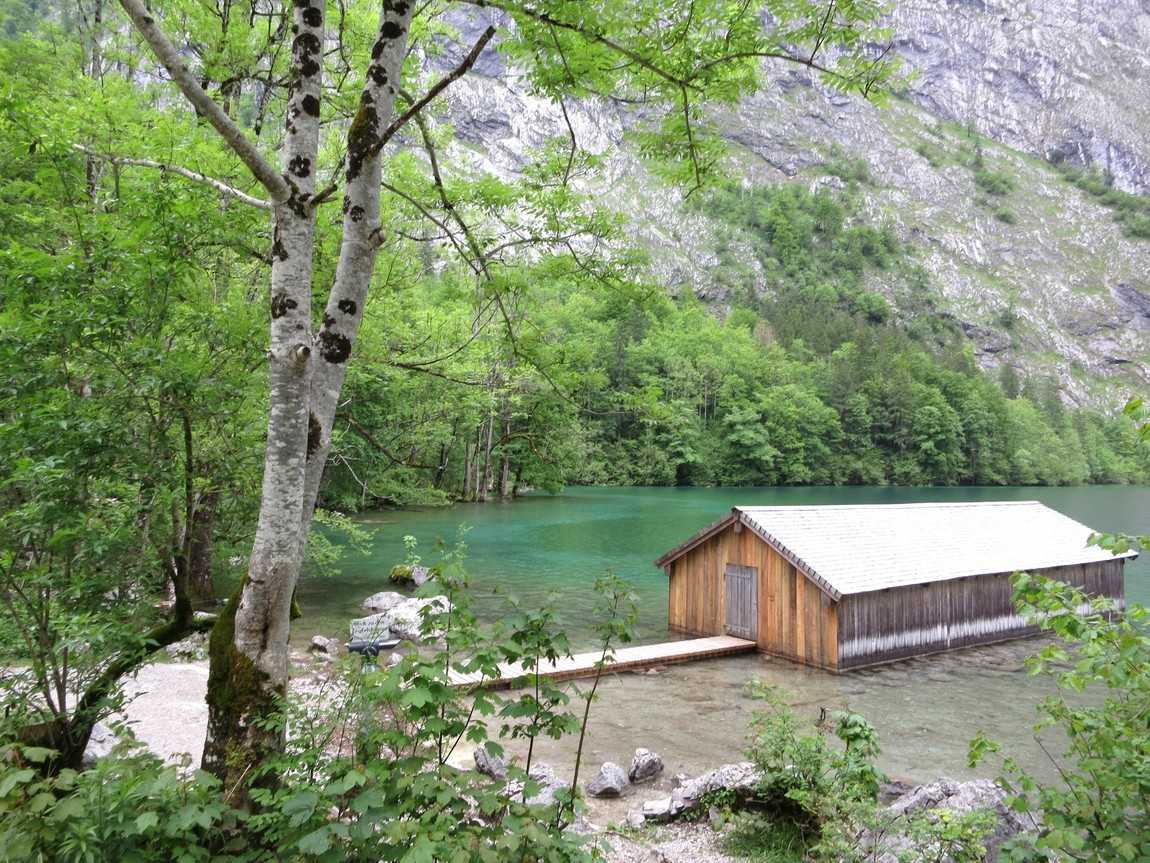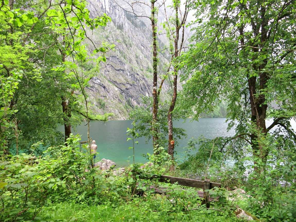 Озеро Кёнигзее, что означает в переводе “Королевское озеро», одно из самых красивых природных достопримечательностей Германии. Большая часть озера лежит на территории Национального парка Берхтесгаден. Вода в озере сине-зелёная. Слева и справа его обступили скалы. Это напоминает фьорды в Финляндии. Погода хмурится, и моросит мелкий дождик. Справа по берегу на промежуточной станции раскинулся мужской монастырь с округлыми куполами.