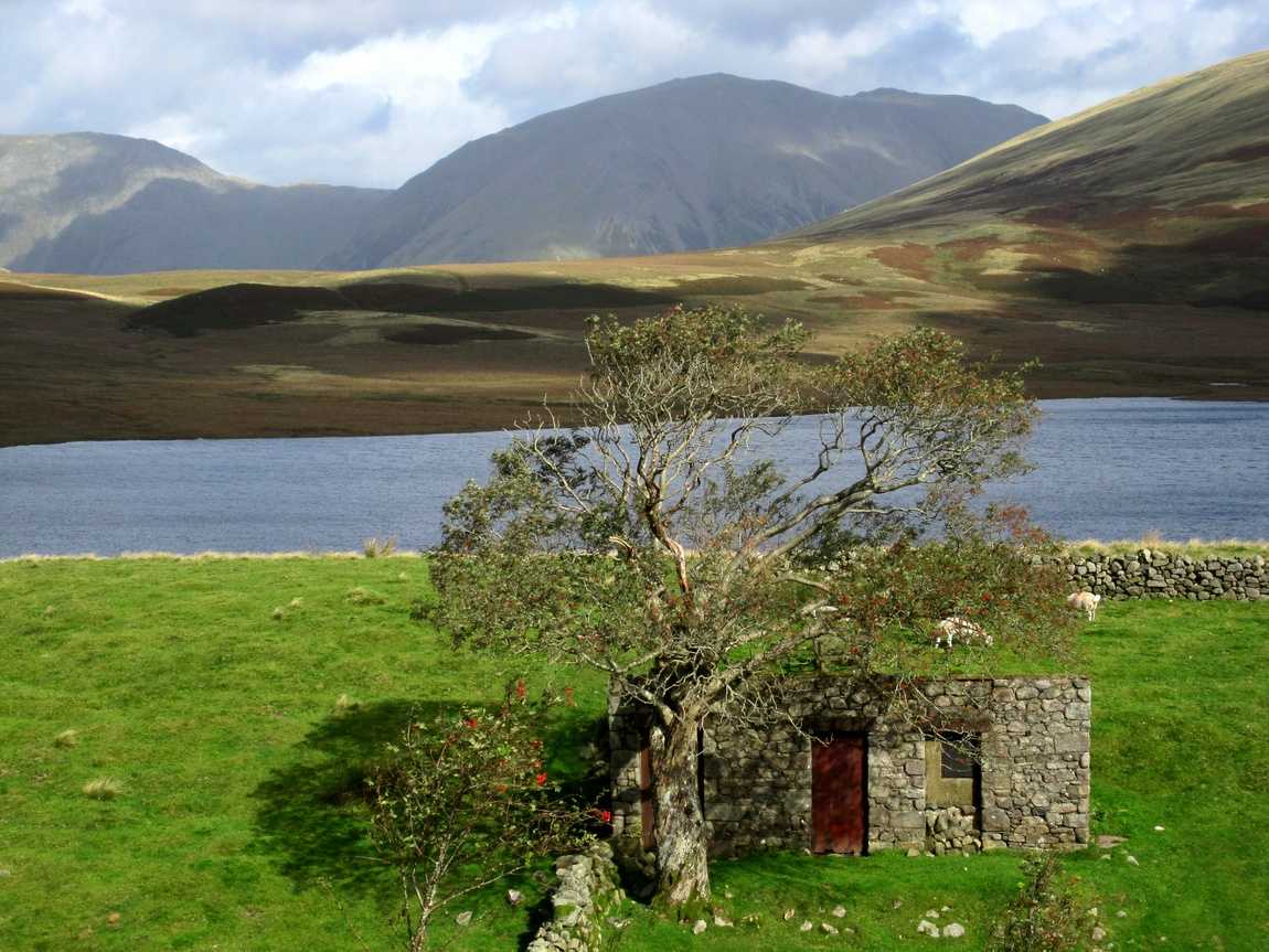 Ещё издали видим полоску воды – это горное озеро Бернмур Тарн, которое раскинулось среди гряды гор. Оно в виде подковы. На пригорке стоит единственный нежилой дом. Вокруг пасётся стадо овец. Здесь когда-то было жерло вулкана. Даже трудно представить, что здесь кипела лава, летели камни. Сейчас здесь тишина, мягкая трава стелется зелёным ковром, и только свежий ветер шумит в ушах. (Англия)