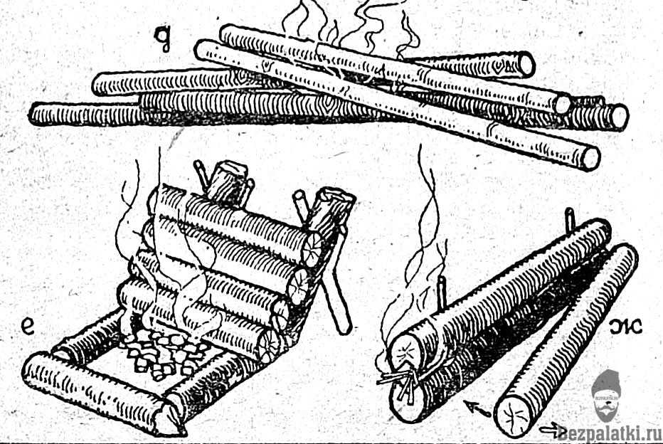 «Американский камин». Этот тип костра относится к кострам очень длительного действия. Толстые короткие поленья с обрубленными сучками и мелкими веточками укладываются так, как показано на( рис. Костры — е.) Огонь разжигается внизу, у основания «горки». Подгорая, нижнее бревно рассыпается постепенно на уголья, на его место соскальзывает следующее бревно и т. д. «Американский костер» применяется канадскими трапперами при ночлеге летом и зимой у костра. Пищу варить на таком костре неудобно. Ночевать у такого костра могут лишь 1—2 чел.