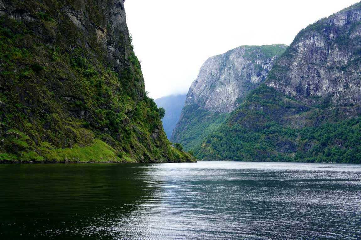 Фьорды в Норвегии. Горы очень близко подходят друг к другу, и когда плывём на прогулочном катере возникает ощущение, что приближаемся в тупик тёмно синих гор.