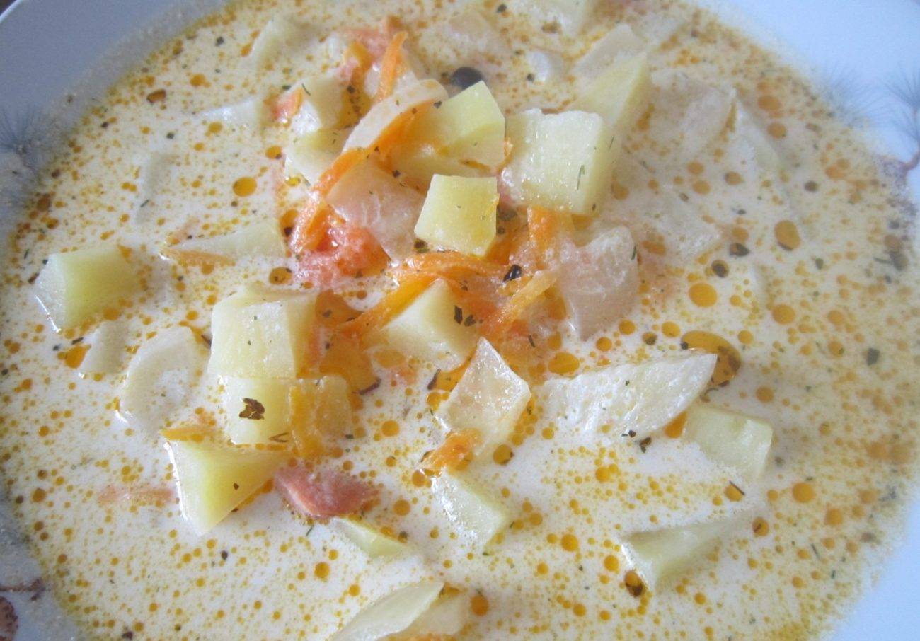 - Шаг 11:Насыпаем сливочную уху по-фински в тарелку