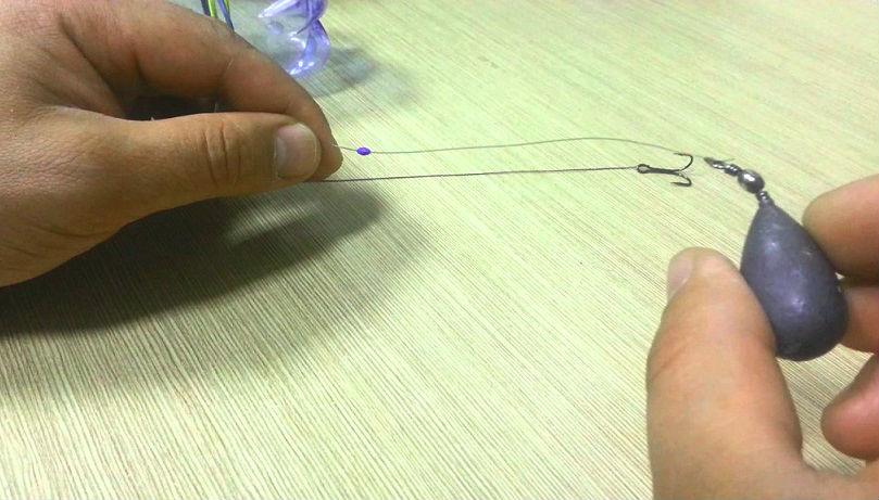 Монтаж оснастки состоит из поводочного материала, скользящего грузила, нескольких стопоров и крючка. Расстояние между грузом и наживкой должно составлять не менее 30 см. Существуют оснастки с применением стационарных грузов, закрепленных с помощью карабина на противозакручивателе. Внешне конструкция напоминает карповую снасть, только вместо привычных бойлов и пеллетса – живая рыбка. Подобные монтажи можно легко сделать своими руками.