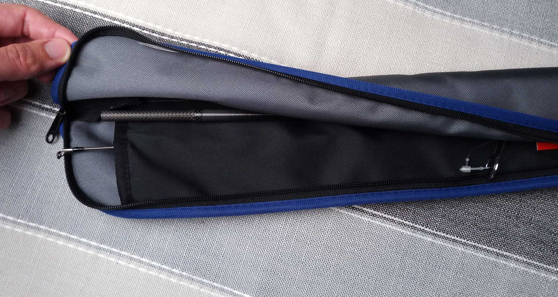 Внутри чехла имеется чуть более короткий кармашек. В нем живет верхнее колено спиннинга. Нижнее живет в основном — большом — отделе. Чехол точно подходит под длину данной модели спиннинга — лишь на пару сантиметров подлиннее.