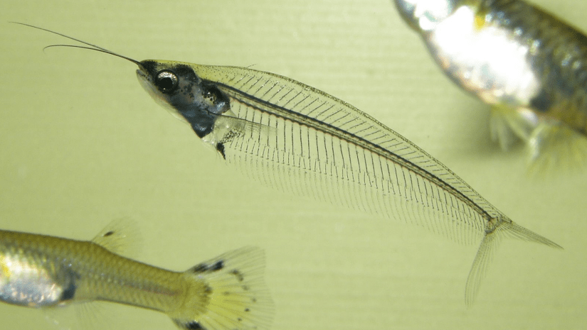 Непрозрачна у сома только голова и «сумка» с внутренними органами. Из верхней губы рыбки растет пара очень длинных усов. На первый взгляд кажется, что у сомика отсутствует спинной плавник, но на самом деле он есть, только очень маленький. Жирового же плавника у этой рыбки для аквариума и в самом деле нет.