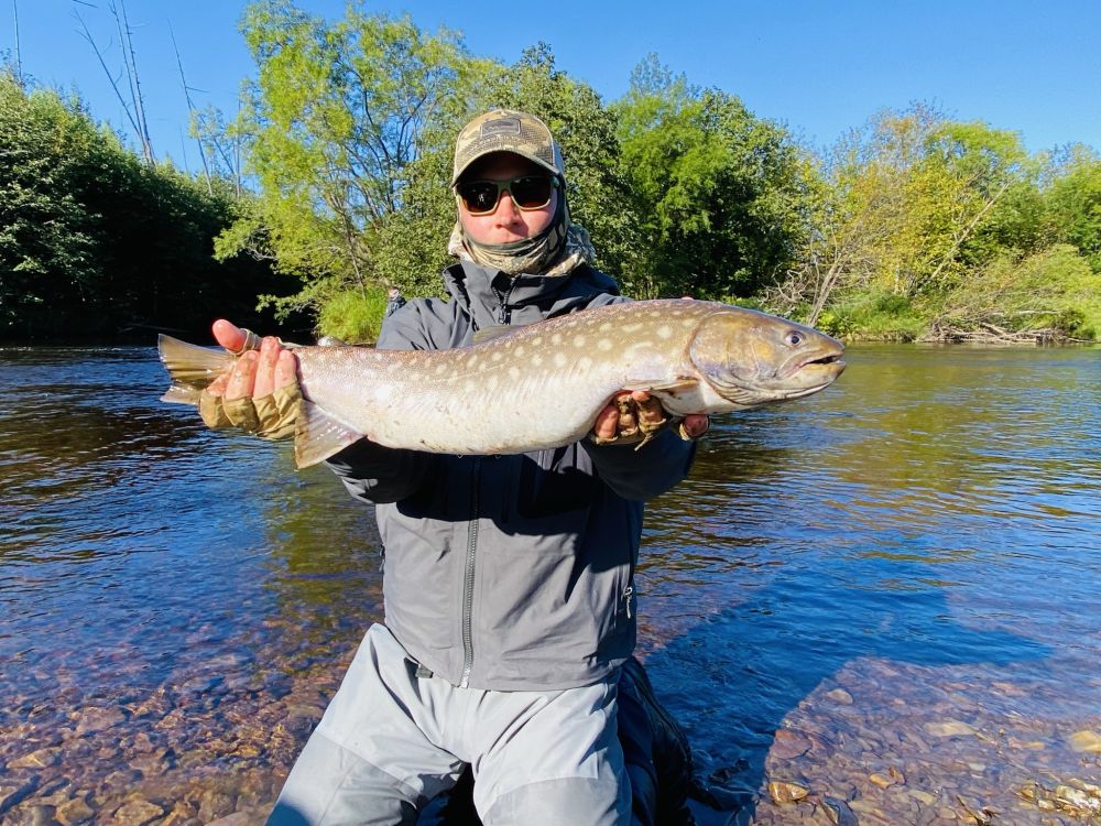 Долго я прокручивала в голове случившееся: то ли таймень приманку плохо взял, хотя по поведению не чувствовалось, то ли таранил валун, чтобы сбросить приманку, то ли я перестаралась со второй подсечкой. Голову сломала, но так и не разобралась. Вспомнились слова Димы Калашникова: «Сахалинский таймень – тонкая материя». А река как-то почувствовала мои расстройства – и с того же плёса одарила меня прекрасной кунджей на четыре кило. Малое утешение, хотя фото получилось очень красивое.