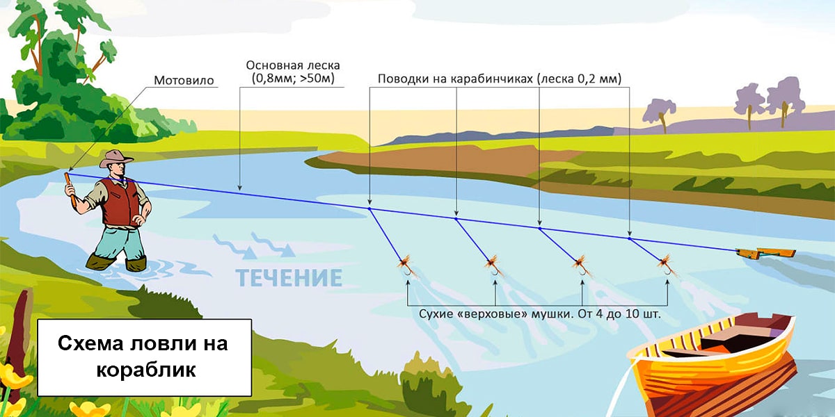 Если в процессе лова будет замечено, что рыба чаще бьёт по какой-то определенной мушке, то остальные мушки следует немедленно заменить на мушки из того же комплекта. Это не отнимает много времени. Крепление поводков мушек на леске-буксире способом петля в петлю позволяет быстро произвести операцию по их замене. Но не только качество мушек обеспечивает успех лова. Нужно еще научиться имитировать ими поведение насекомого. Кораблик позволяет перемещать мушки по поверхности воды с разной скоростью, а постоянные мелкие колебательные движения кончиком удилища будут имитировать попытку насекомого взлететь.
