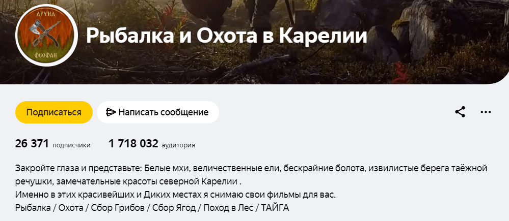 Рыбалка и охота в Карелии. Тут у человека целый видеоблог. Немного такого формата я тоже планирую добавлять. На канале почти по 200 000 просмотров на каждом ролике.