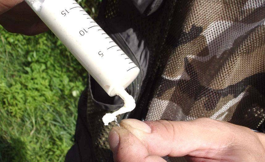 - жидкий полуфабрикат. Вязкую массу наматывают на крючок при помощи палочки, и проглотить ее рыбе легче, но, по уверениям некоторых рыболовов, держится на крючке она хуже. Хранить такую смесь удобно в шприце или в тюбике из-под зубной пасты: для этого низ тюбика срезают, внутреннюю часть промывают (если паста была мятная – то промывают без марганцовки, это придаст привлекательный аромат мяты для насадки) и наполняют тестом, после чего заворачивают низ. Отвинтив колпачок, можно выдавить необходимое количество смеси на крючок.