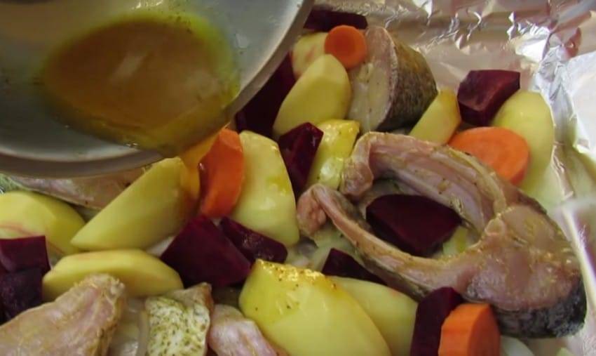 Картофель, вымоченный в рыбном соке, очень вкусен. Сам толстый лосось, замаринованный в лимонном соусе, также будет нежным, сочным и вкусным.