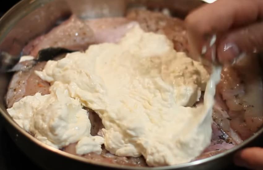 2. Сметану смешивают с солью и сушеной зеленью. Рыбку снаружи и внутри обмазывают сметаной, оставляют мариноваться на 30 минут.