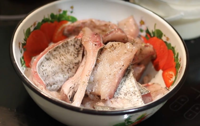 Мясо рыбы споласкивается, нарезается на порционные кусочки, смазывается сметаной. Желательно это кушанье не обливать сметанный соусом, а немного промазать.