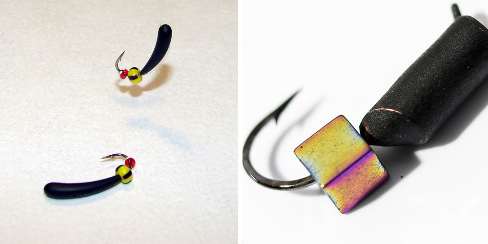 Можно использовать в качестве безмотылки и обычные насадочные мормышки, добавив на них искусственные точки атаки. Важным условием при безнасадочной ловле является тонкая настройка всей оснастки.